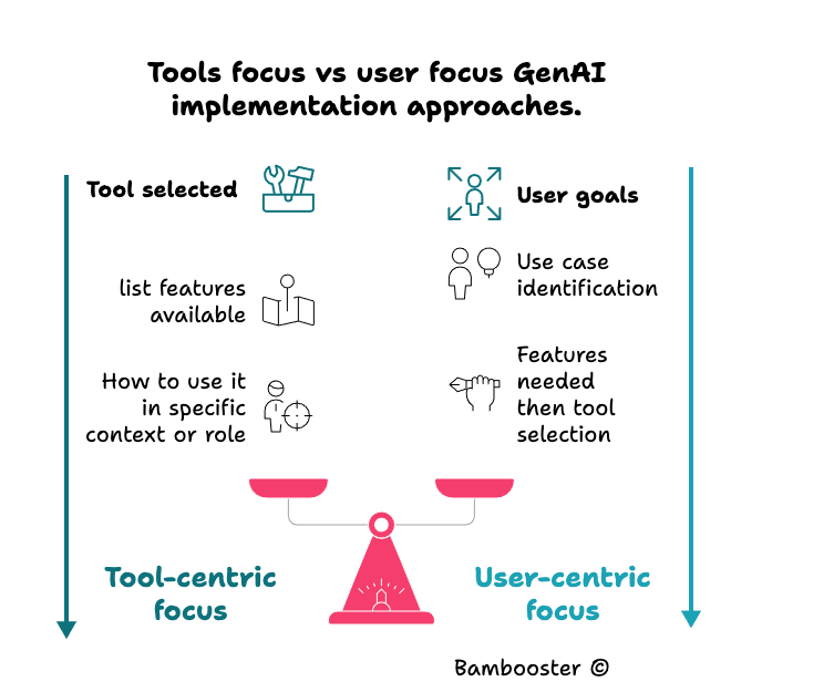 β So here are the 2 approaches I see: user-focused vs tool-focused. Approach #1 (Tool-First): Looking at the tool β then the features β then how to use it in a specific context (e.g., GenAI in access, in marketing, GenAI in HR). Approach #2 (User-First): Looking at their goals, frustrations, or wishes β identify use cases where GenAI could help achieve their goal better or faster β determine capabilities needed β select the right tool β As an innovation expert, I am used to starting from the end user's needs. So that has been my go-to default way to think, test and apply GenAII. It turns out to be the best, and I think today the only way to really succeed. I will show you how. β β¨ HackHere is my coaching approach, with five steps, and how you can apply them to your team. β Step 1: Expand Their Horizon with the 4 GenAI ProfilesDuring your first coaching session, I show the 4 AI profiles in a personal "guided tour" of my company's setup at Bambooster: