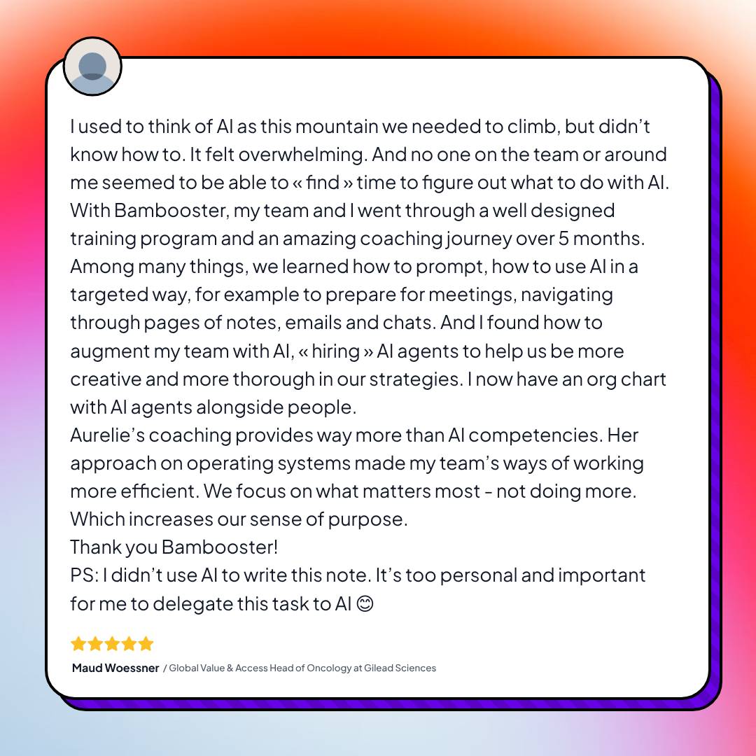 Hi, I'm Aurélie, a "coachultant" (certified systemic coach + consultant) and facilitator, specialized in innovation in healthcare and sustainability. I enable teams and leaders to accelerate from initial ideas to 1st pilot, GenAI been one of many ressource. I support big pharma (Roche, Pfizer, MSD...) and accelerators in AI, Digital health and medtech. I bring creativity and disciplined methods with contagious energy and smile. I have a No BlaBla, No Bullshit, and no Blingbling values. I am an entrepreneur & Mum of 3 boys aware that I only have one life, so I want to make the most of it!